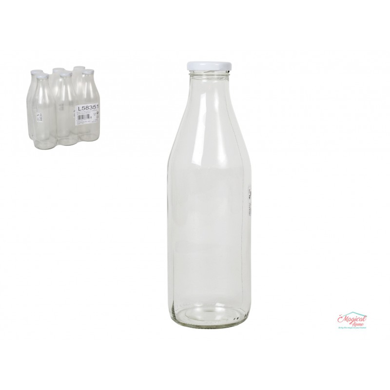 Sticlă cu dop 1L sticla are profil rotund ,volumul de 1 litru și poate fi utilizată pentru a pastra lichide: lapte, suc, apa, ulei, otet, sosuri. Sticla este prevazuta cu un dop cu inchidere prin infiletare.