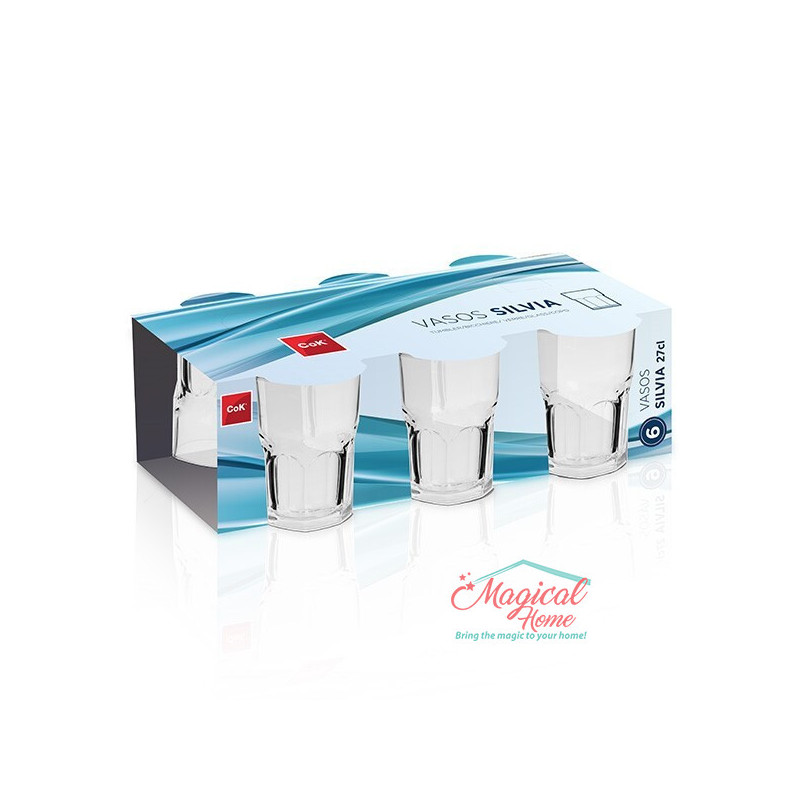 Set 6 pahare pentru apă, din sticlă, transparente 6x270 ml Silvia: paharele sunt fabricate din sticlă transparentă. Paharele au formă tronconica şi pot fi folosite pentru apă, suc, lapte, ceai, cafea sau orice alte lichide. Volumul unui pahar este de 270 ml.