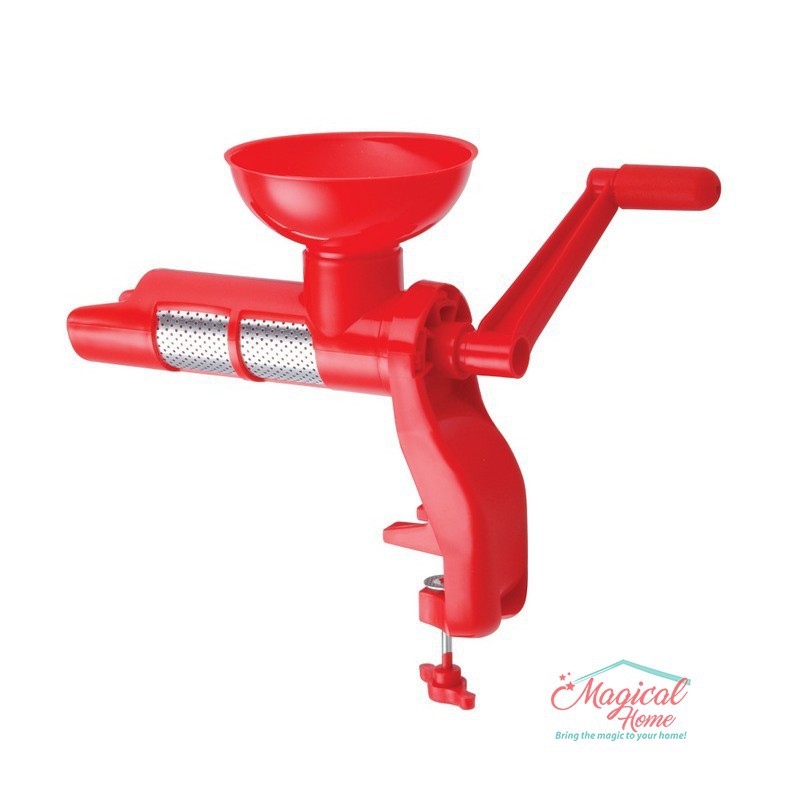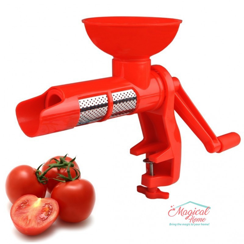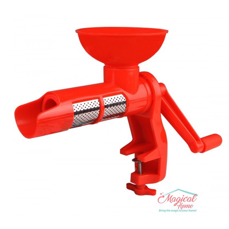 Masina manuala pentru prepararea sucului de rosii este dotata cu sita din otel inoxidabil alimentar. Partile componente ale masinii care vin in contact cu rosiile sunt din amteriala platic de uz alimentar.